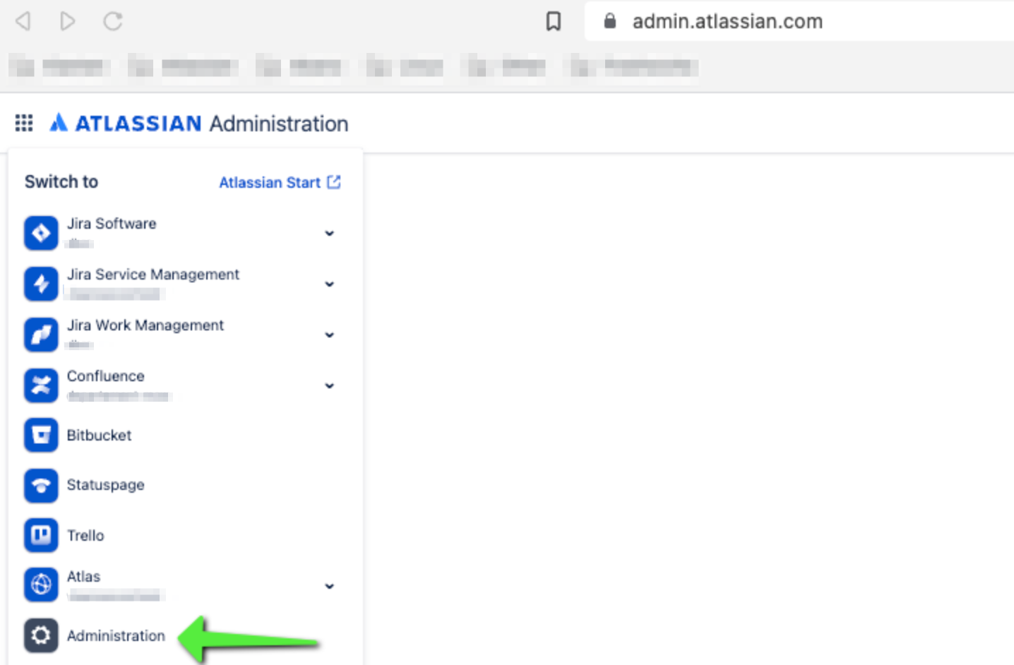 Surf naar https://admin.atlassian.com/ of klik wanneer je ingelogd bent op je Atlassian omgeving op de tegel links bovenaan en selecteer daar “Administration”.