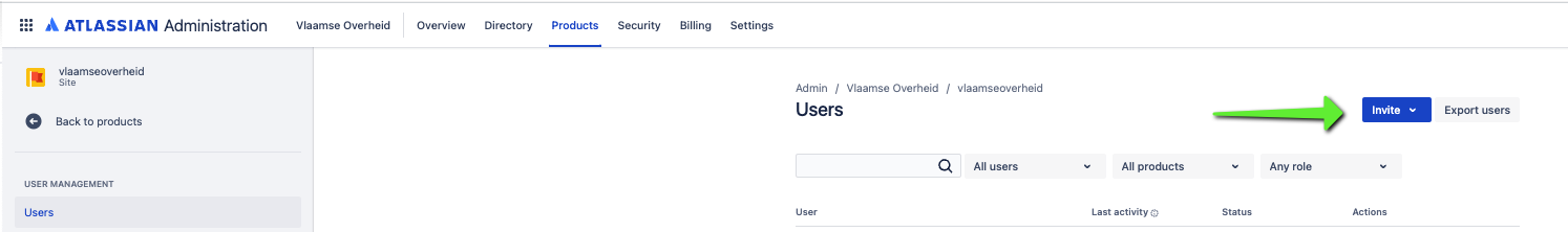 Mocht je Administrator toegangsrechten hebben voor meerdere Atlassian organisaties, zal je eerst Vlaamse Overheid moeten kiezen, om naar de juiste administrator portaal te navigeren
